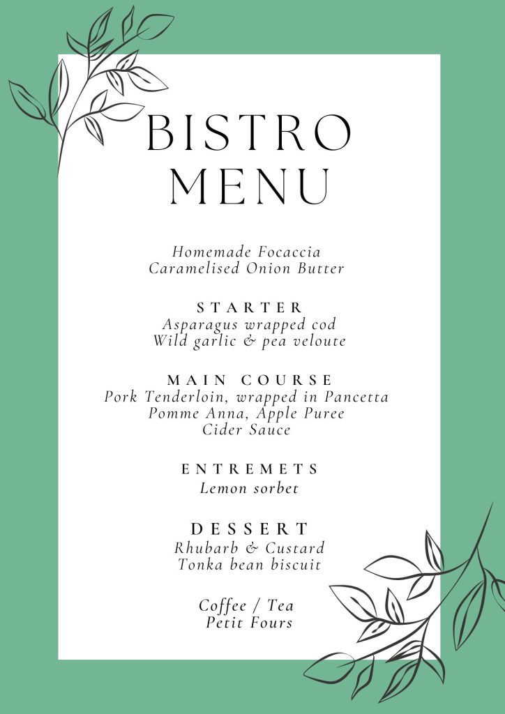 We have regular Bistro Nights. These evenings are a set price and includes freshly made bread, a vibrant set menu & coffee with petit fours to finish. The menu changes in line with what’s in season. All items are made on site by our experienced chefs. We try our best to cater to all. If you have any dietary requirements please do not hesitate to get in contact to see what we can offer.